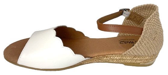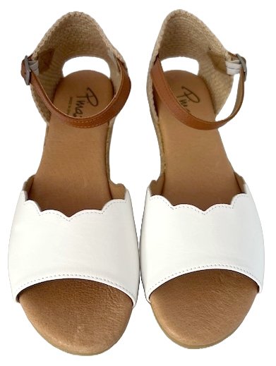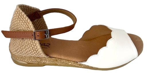 SIMPLE YET ELEGANT ON THE FOOT. FEATURING A WIDE LEATHER STRAP ACROSS THE FOREFOOT AND AN ADJUSTABLE ANKLE STRAP. SMALL WEDGE WITH A ROPE DEATIL AND FINISHED WITH A GOLD METAIL DETAIL ON THE HEEL. MADE IN SPAIN