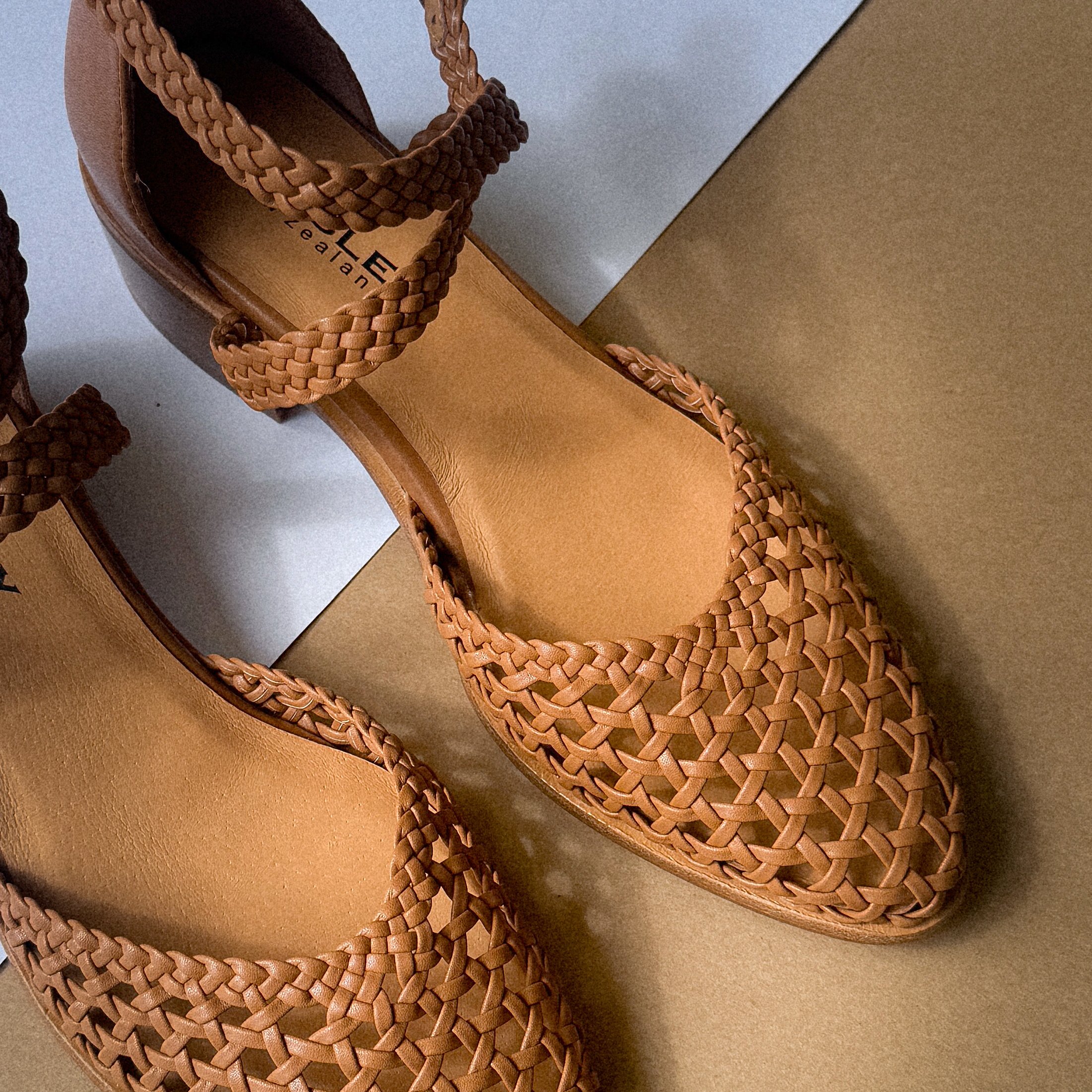 Earthy, refined, and full of texture, this woven sandal blends artisanal detail with everyday ease. With rich tan tones, braided leatherwork, and a comfortable mid heel, it’s a versatile staple that brings grounded charm to any look.