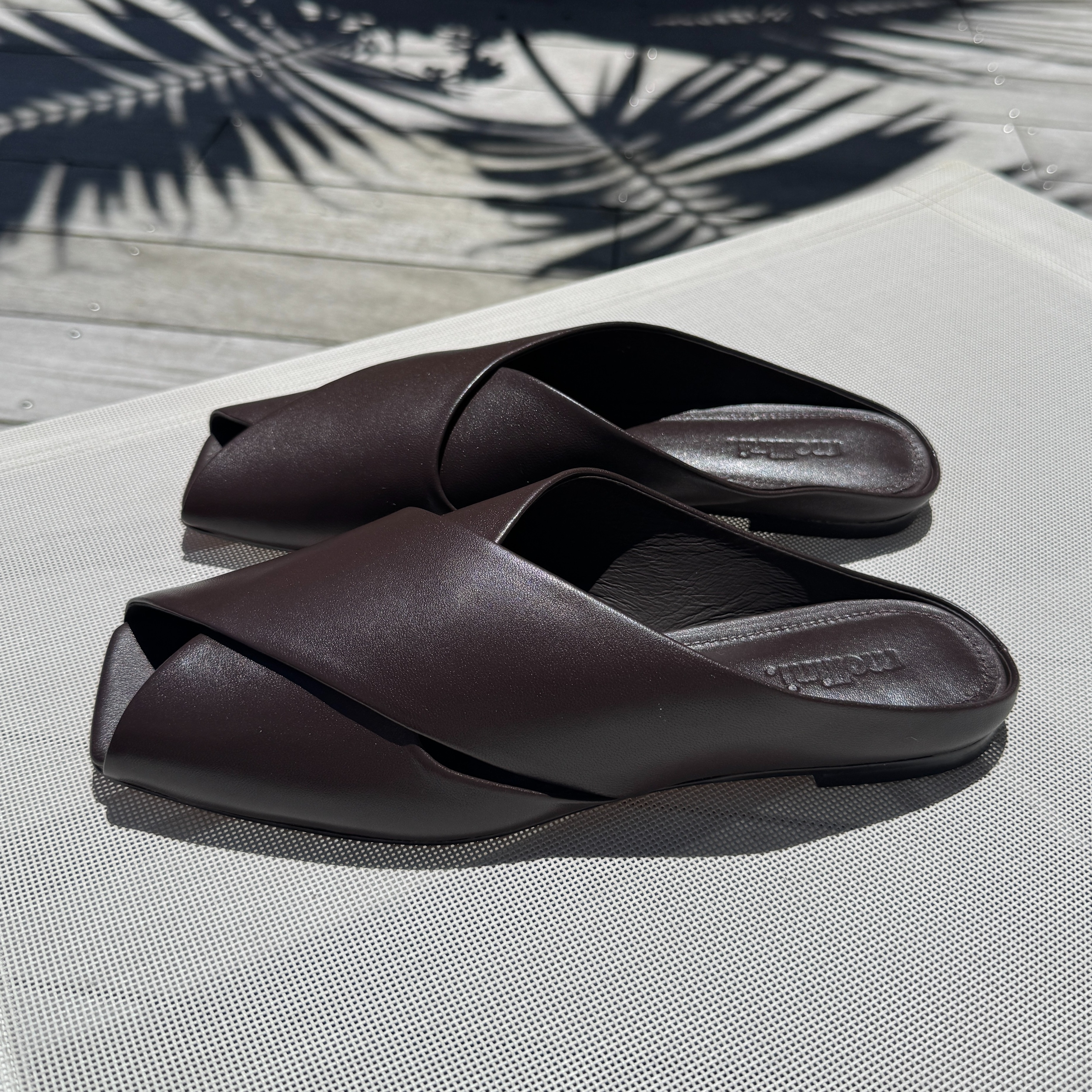 Modern minimalism meets effortless edge in Barnee by Mollini. This sculptural slide features a soft, folded leather upper with a subtle peep toe, giving it a sleek, architectural feel while staying beautifully understated. The rich brown tone adds warmth and versatility, making it a refined choice for everyday wear or elevated casual styling.