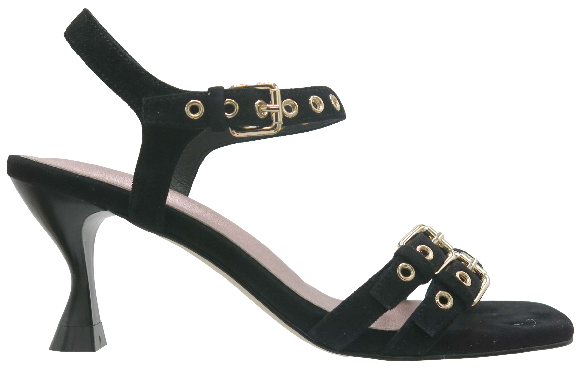 A sleek and sophisticated sandal that blends timeless elegance with a modern edge. Crafted in luxe black suede, Besure features striking gold buckle hardware and a sculpted flared heel for statement style. Perfect for elevating your evening or occasion wear.