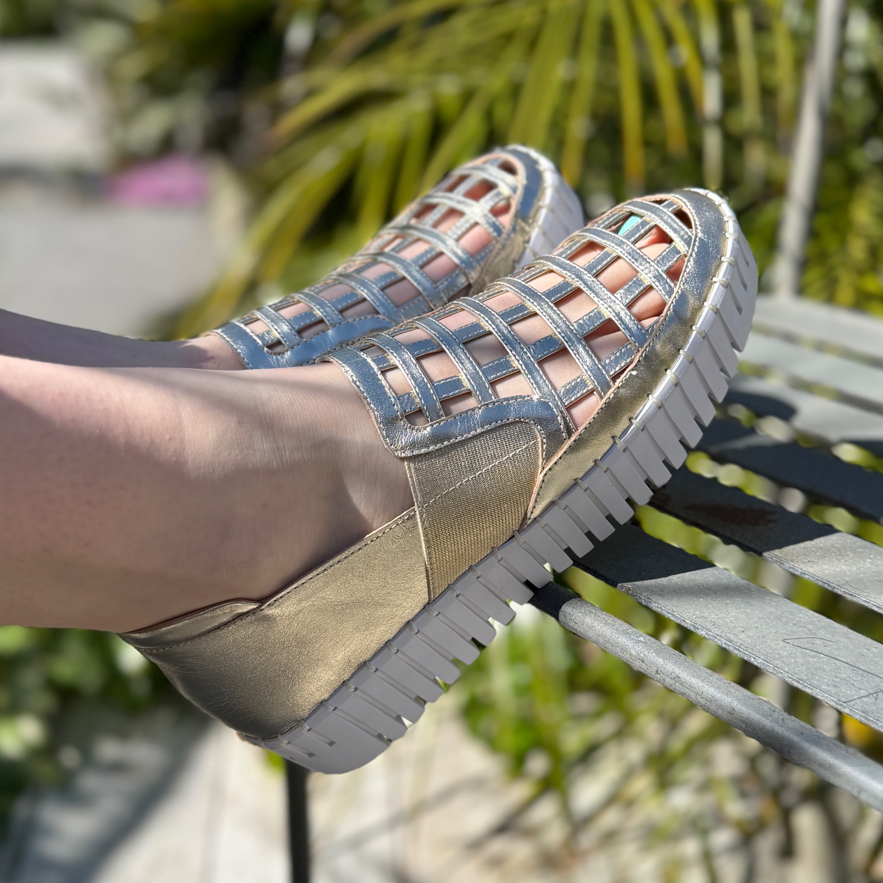 Add a bold twist to your wardrobe with these statement gold flatforms. With their lattice leather upper and chunky sole, they blend edgy style with breathable comfort.