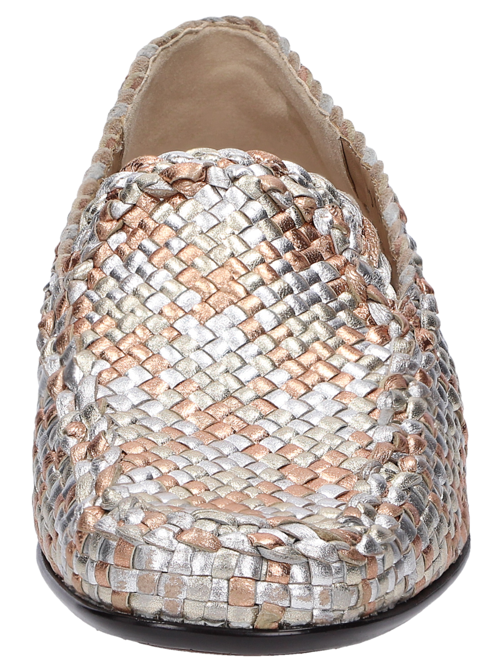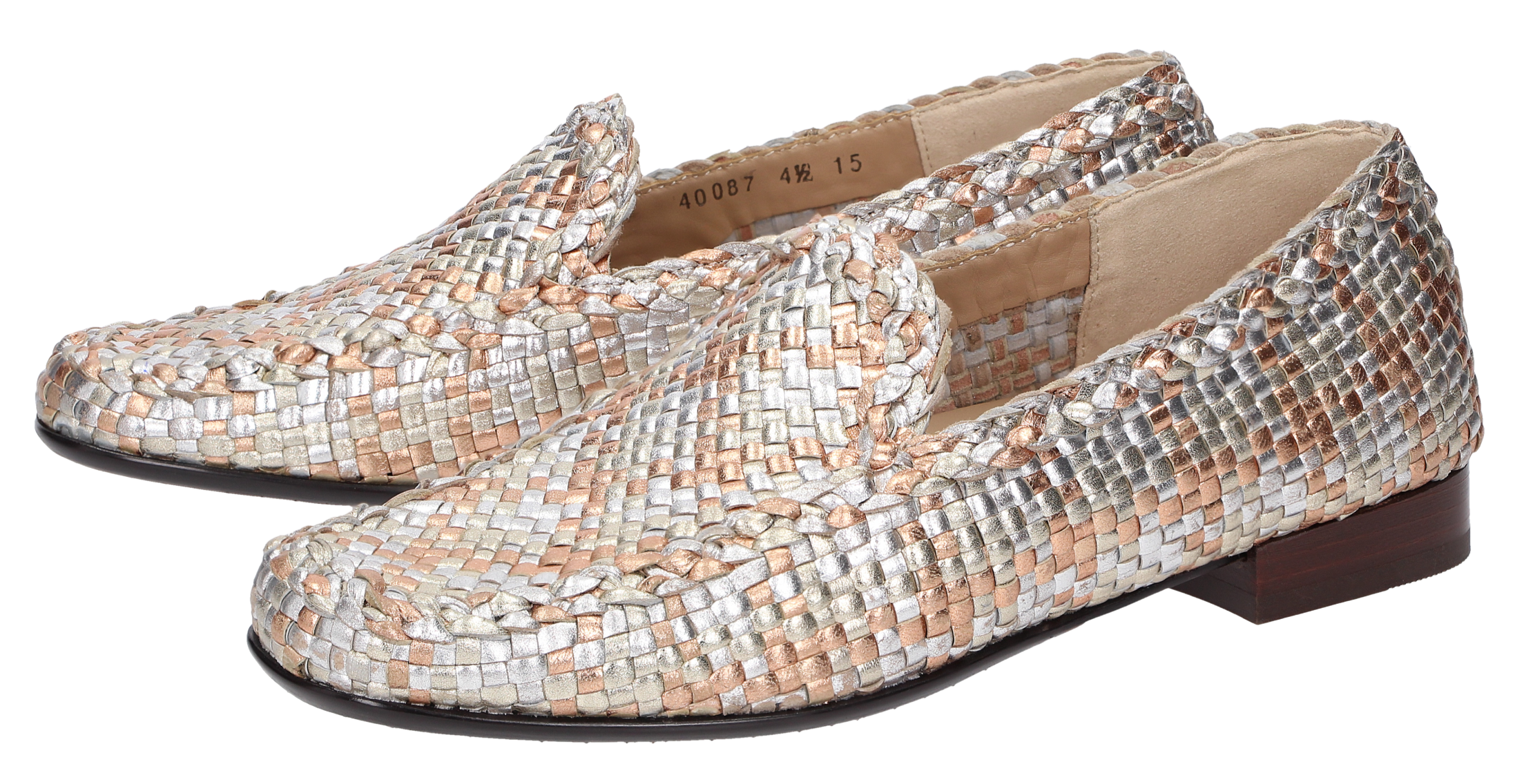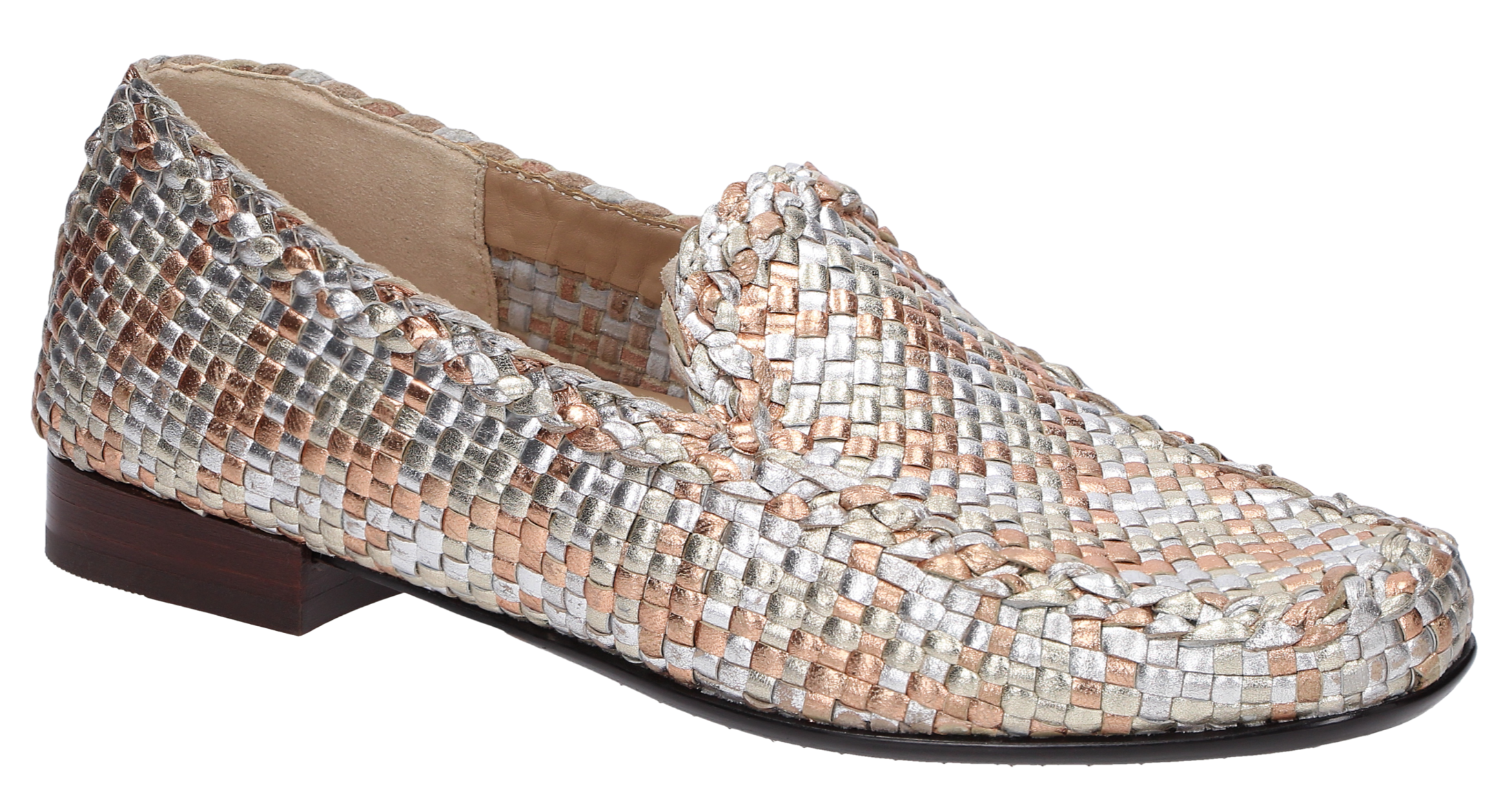 This women's flat loafer is crafted from supple, hand-braided metallic goat leather, featuring a detailed collar and tongue for added elegance. Unlined and ideal for barefoot wear, it includes a cushioned calf leather insole, slim width, and a soft rubber sole with a slight heel for subtle lift.