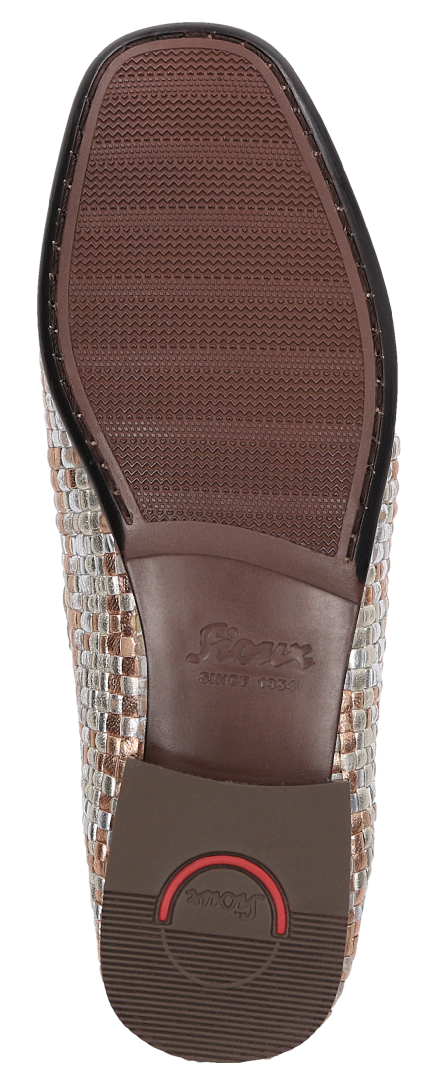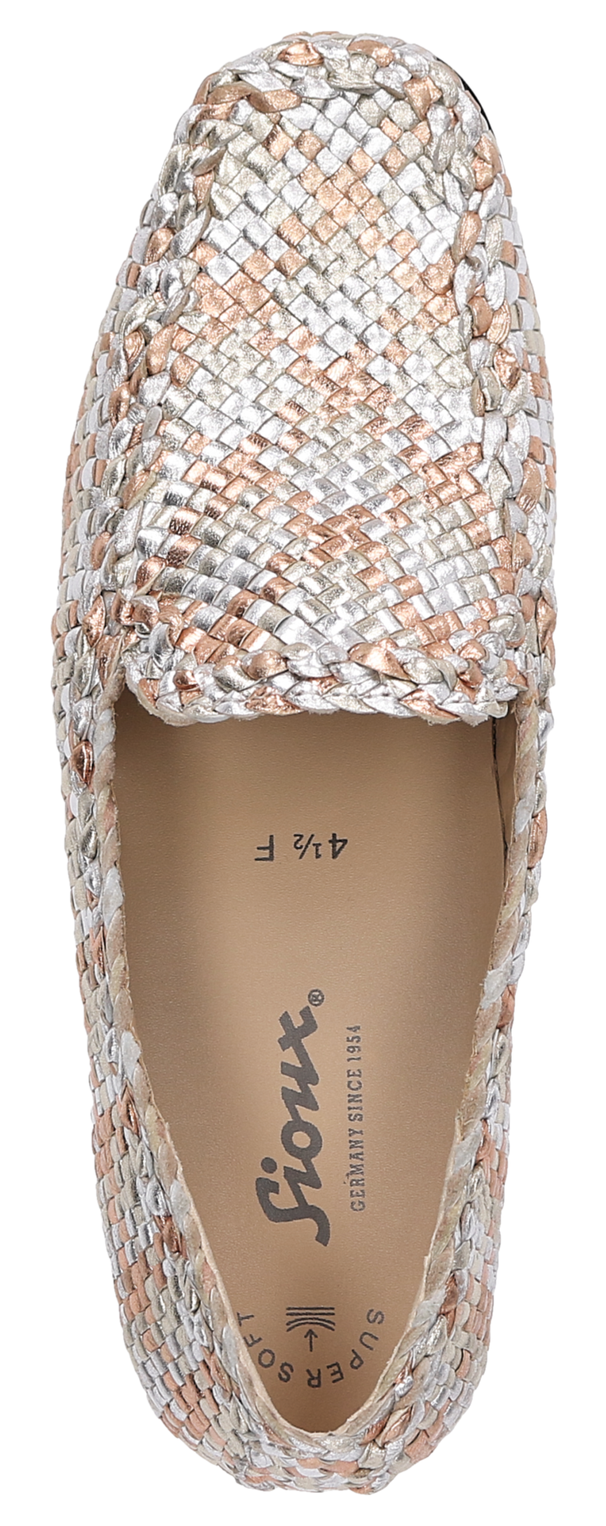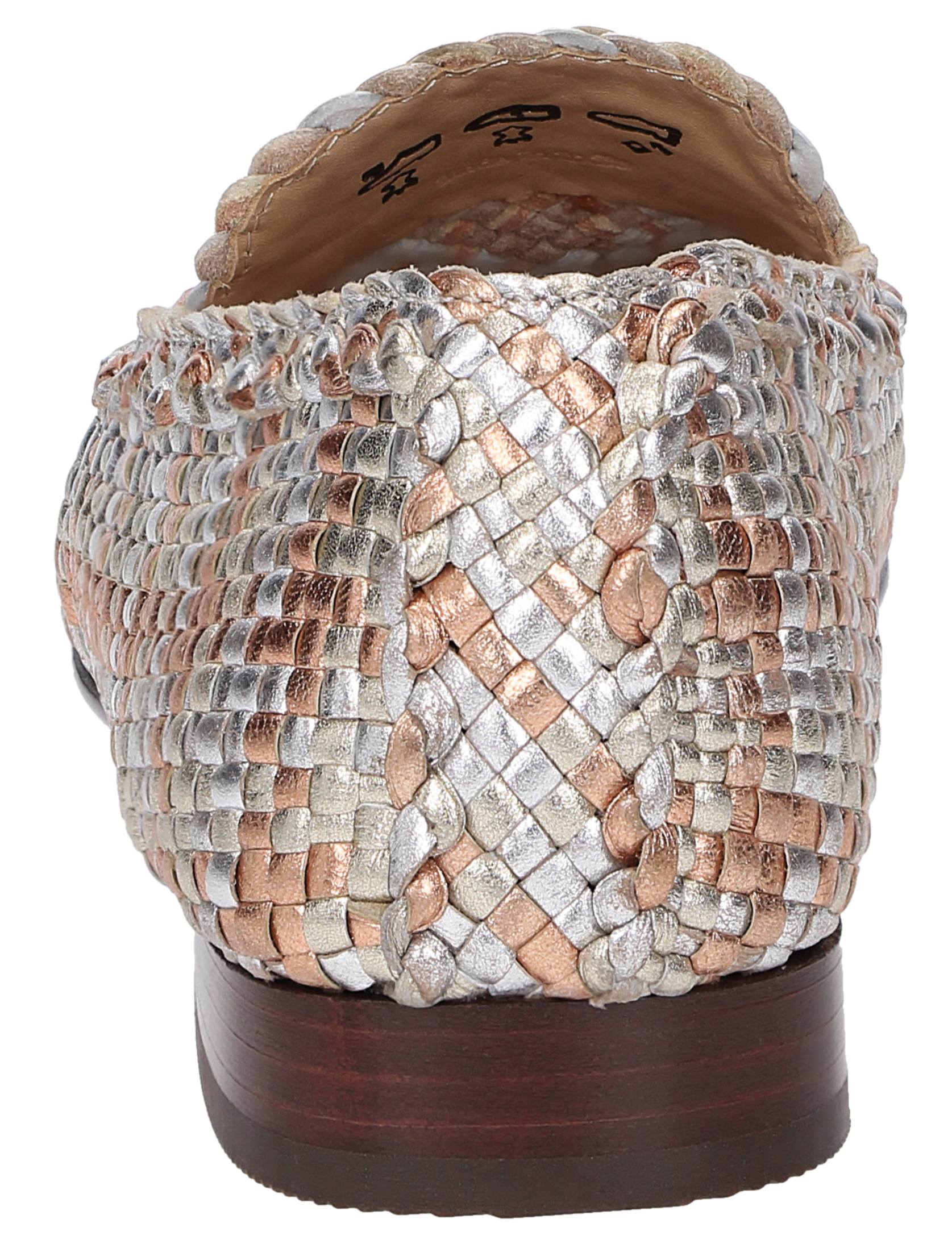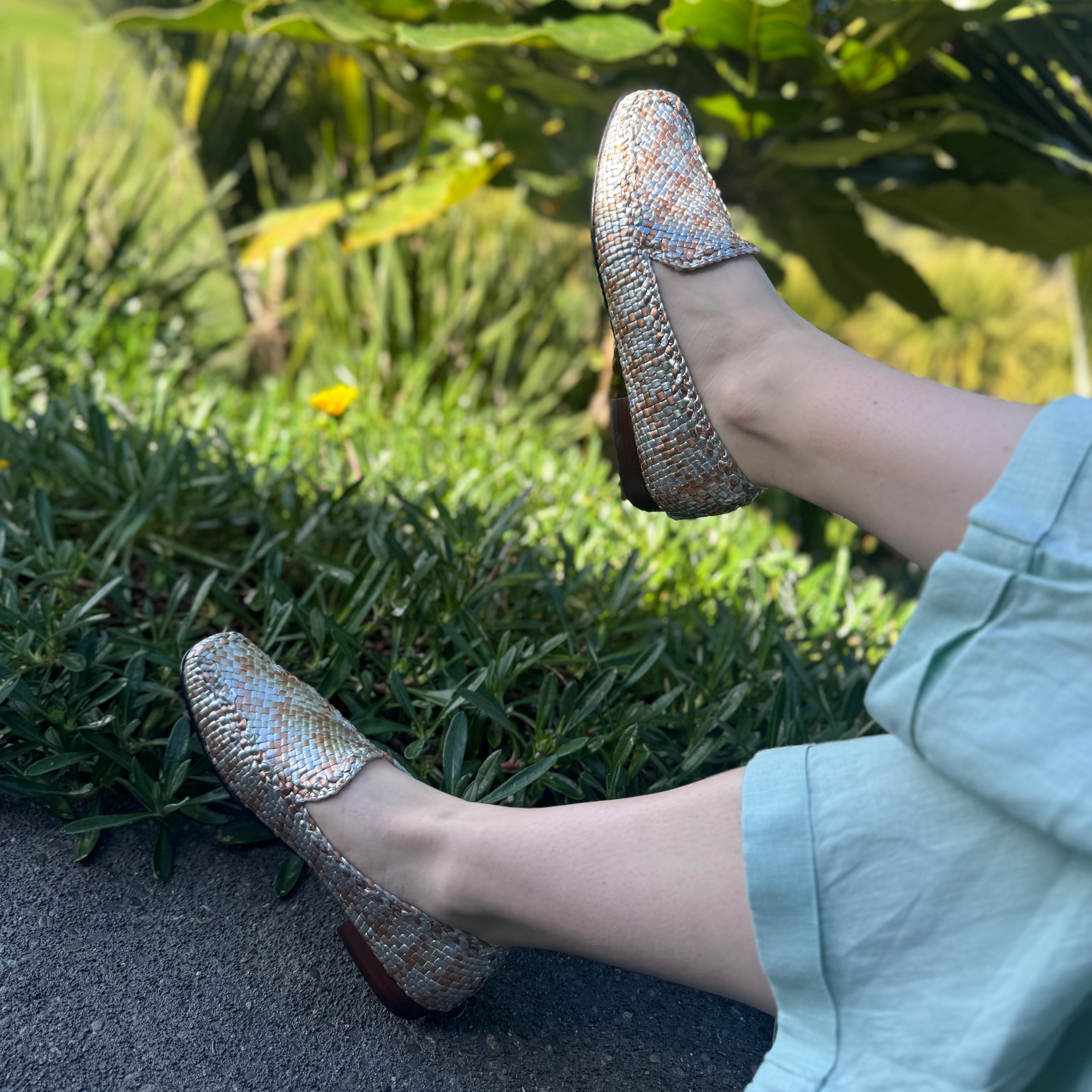 This women's flat loafer is crafted from supple, hand-braided metallic goat leather, featuring a detailed collar and tongue for added elegance. Unlined and ideal for barefoot wear, it includes a cushioned calf leather insole, slim width, and a soft rubber sole with a slight heel for subtle lift.