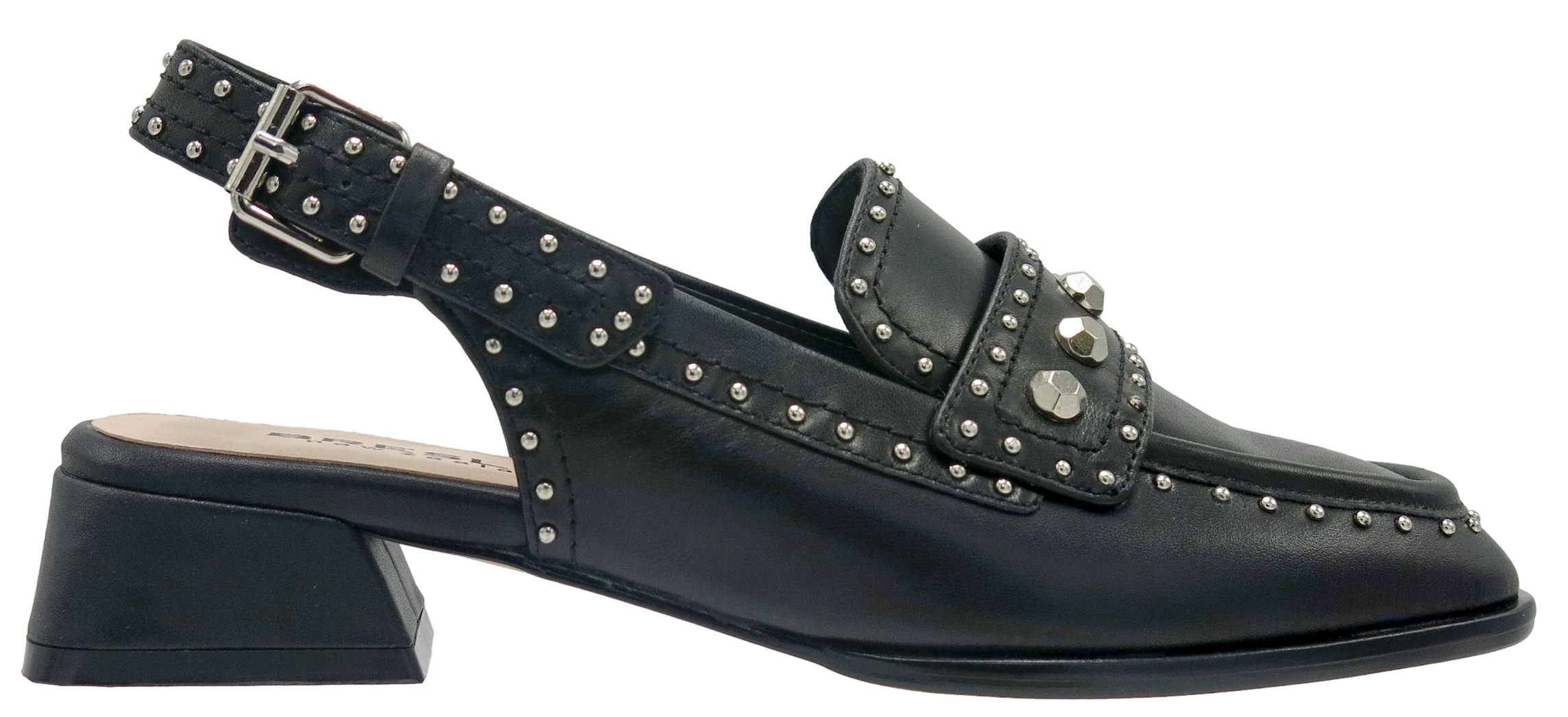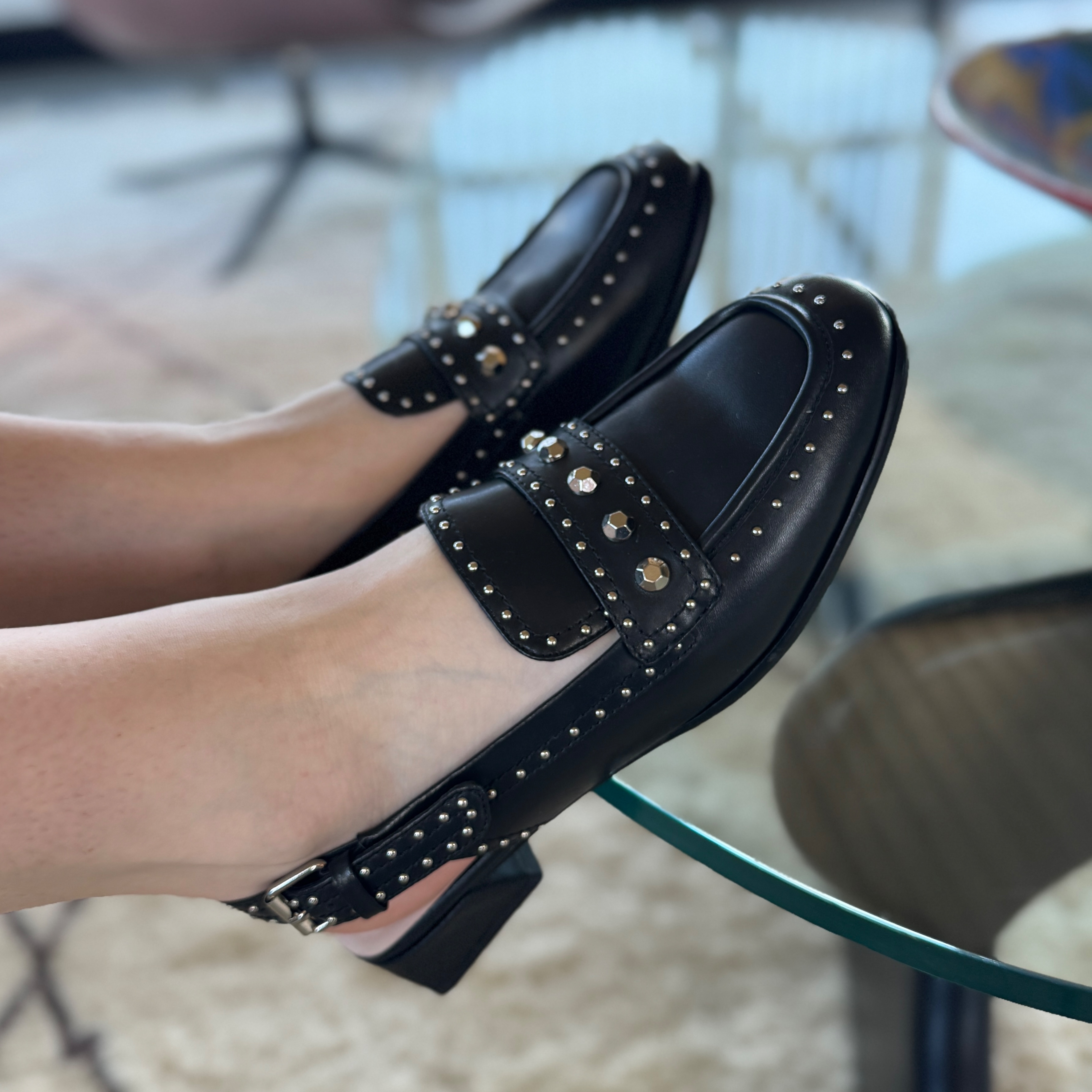 Edgy yet versatile, the Digit is a NZ-designed leather slingback that pairs bold stud detailing with a sleek block heel. A modern twist on a loafer silhouette, it delivers statement style without compromising on comfort.