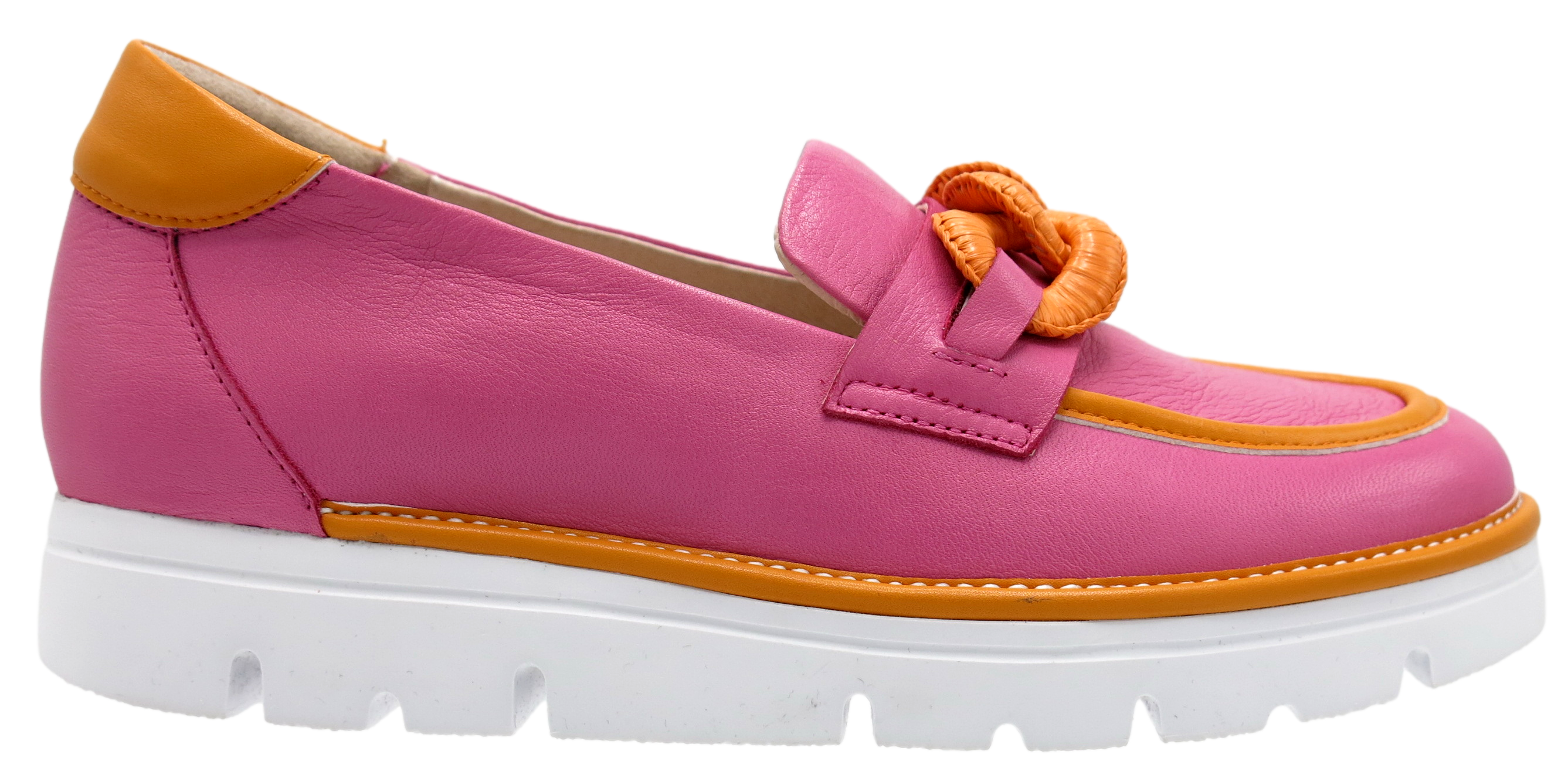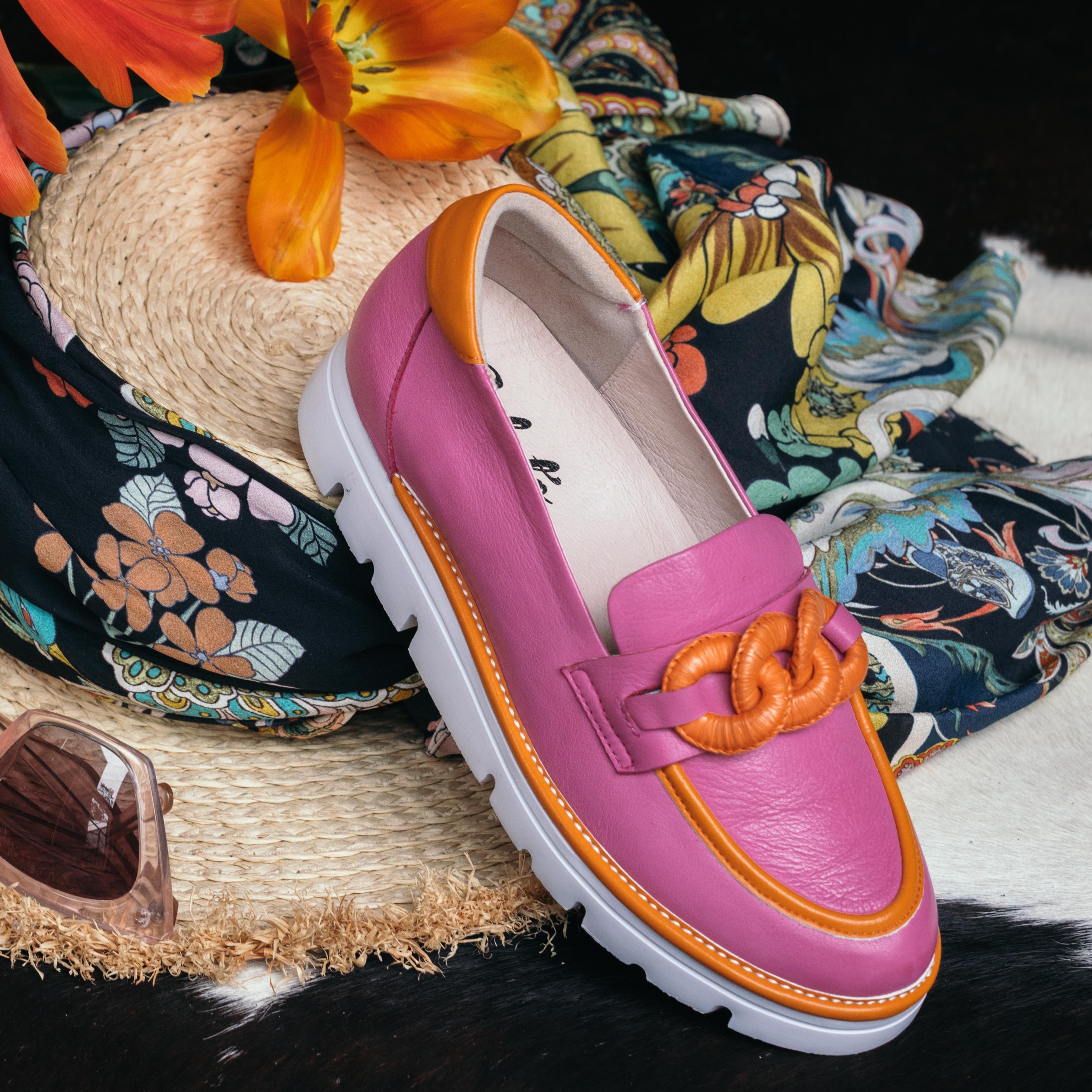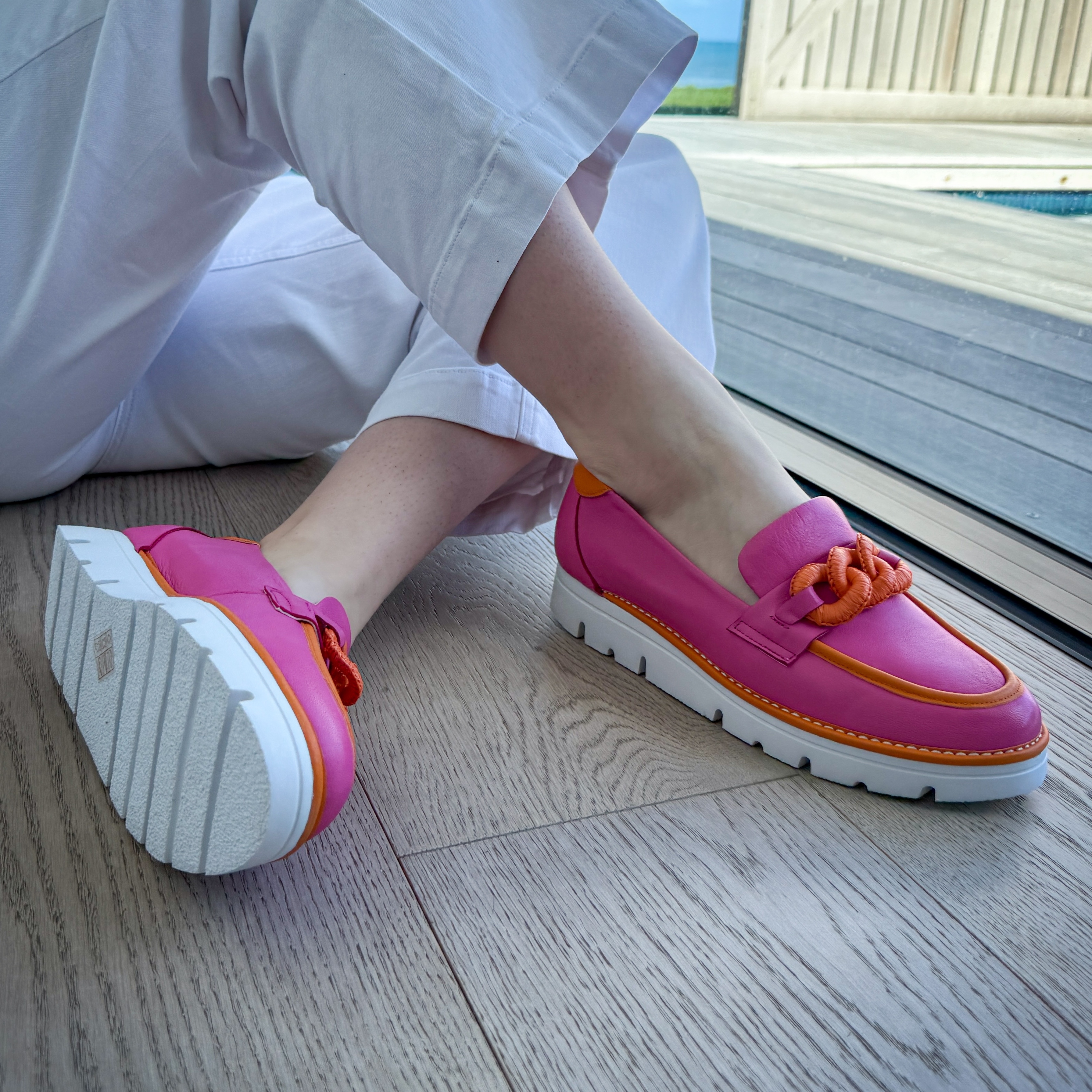 Bold and playful, the Eject loafer by Gelato is all about standing out in colour and comfort. Crafted in soft leather with a chunky sole, it pairs fuchsia pink with bright orange accents for a fun twist on a classic style.