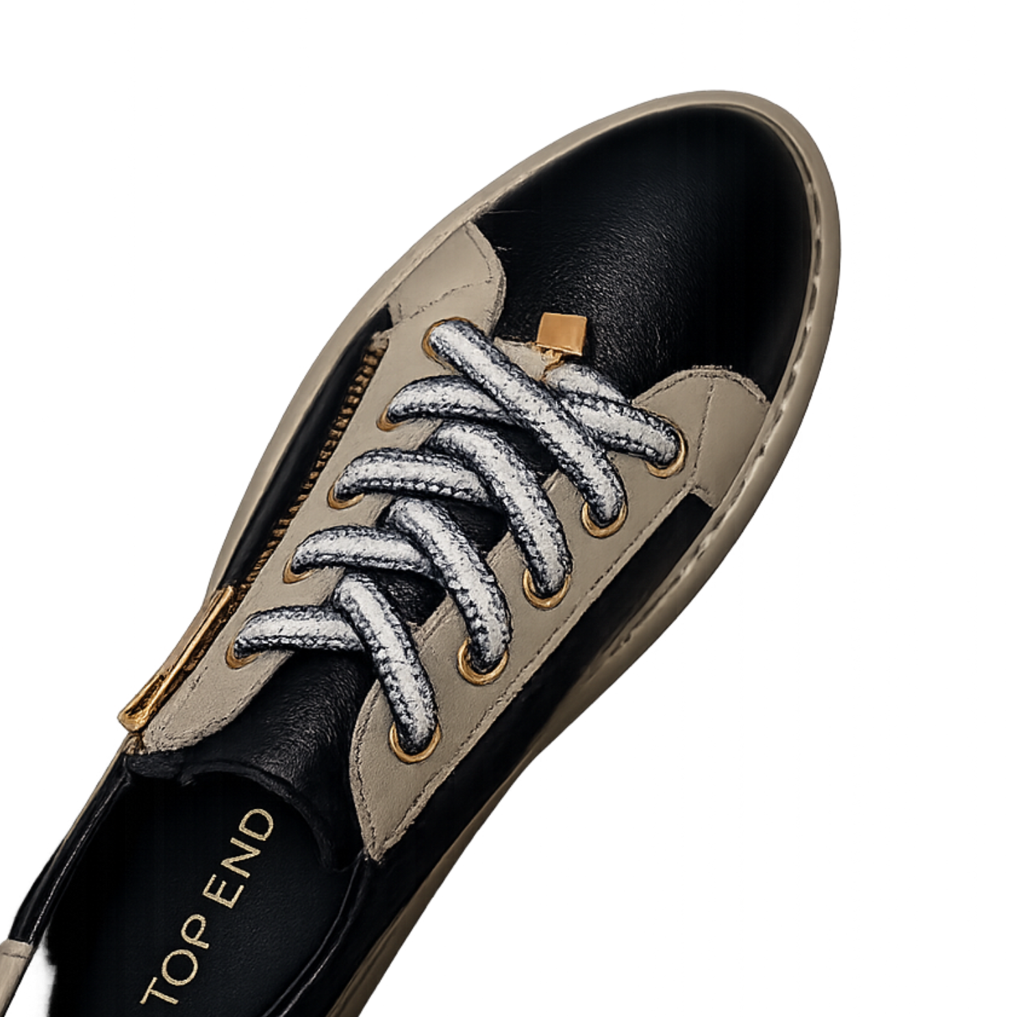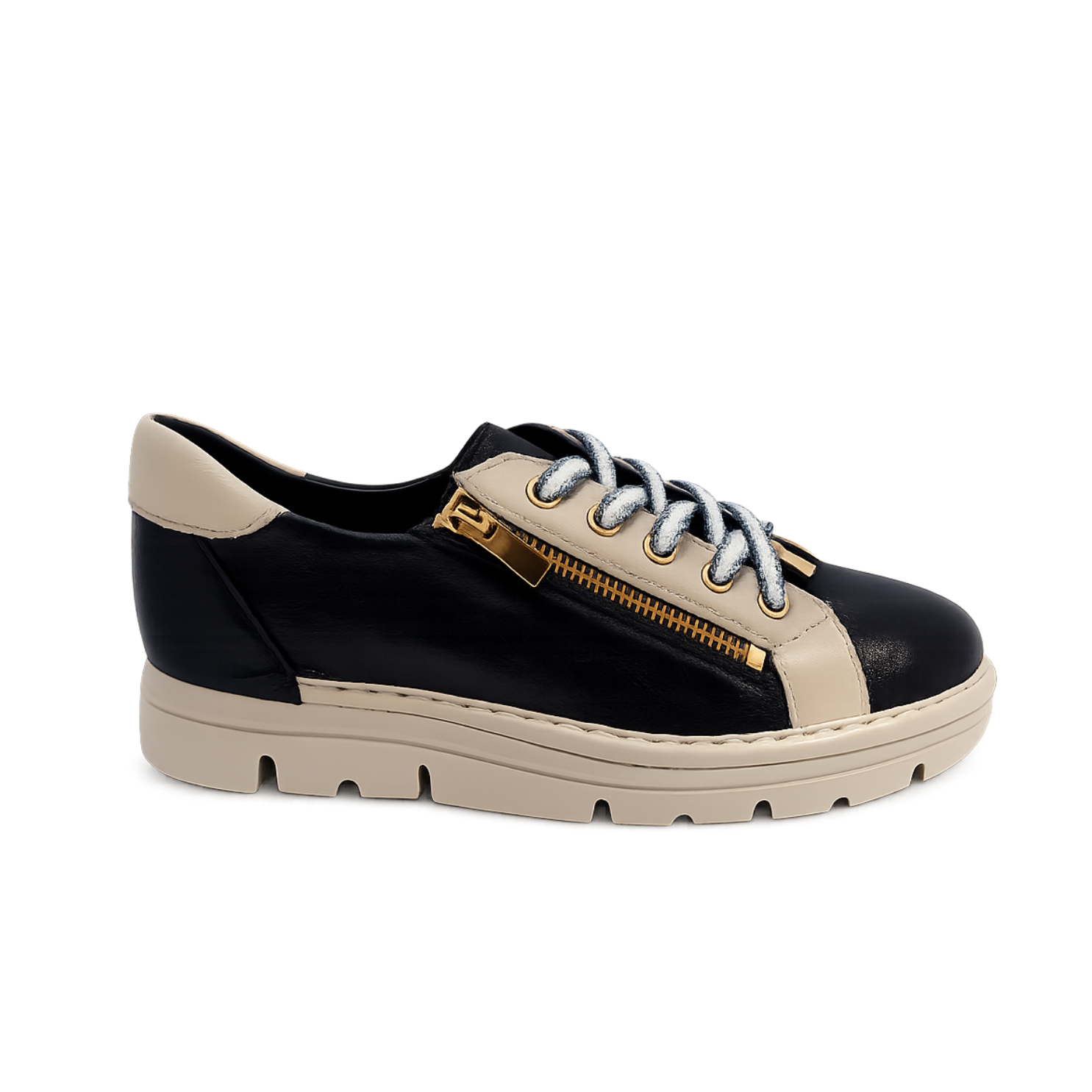 Navy leather upper with soft cream contrast panels