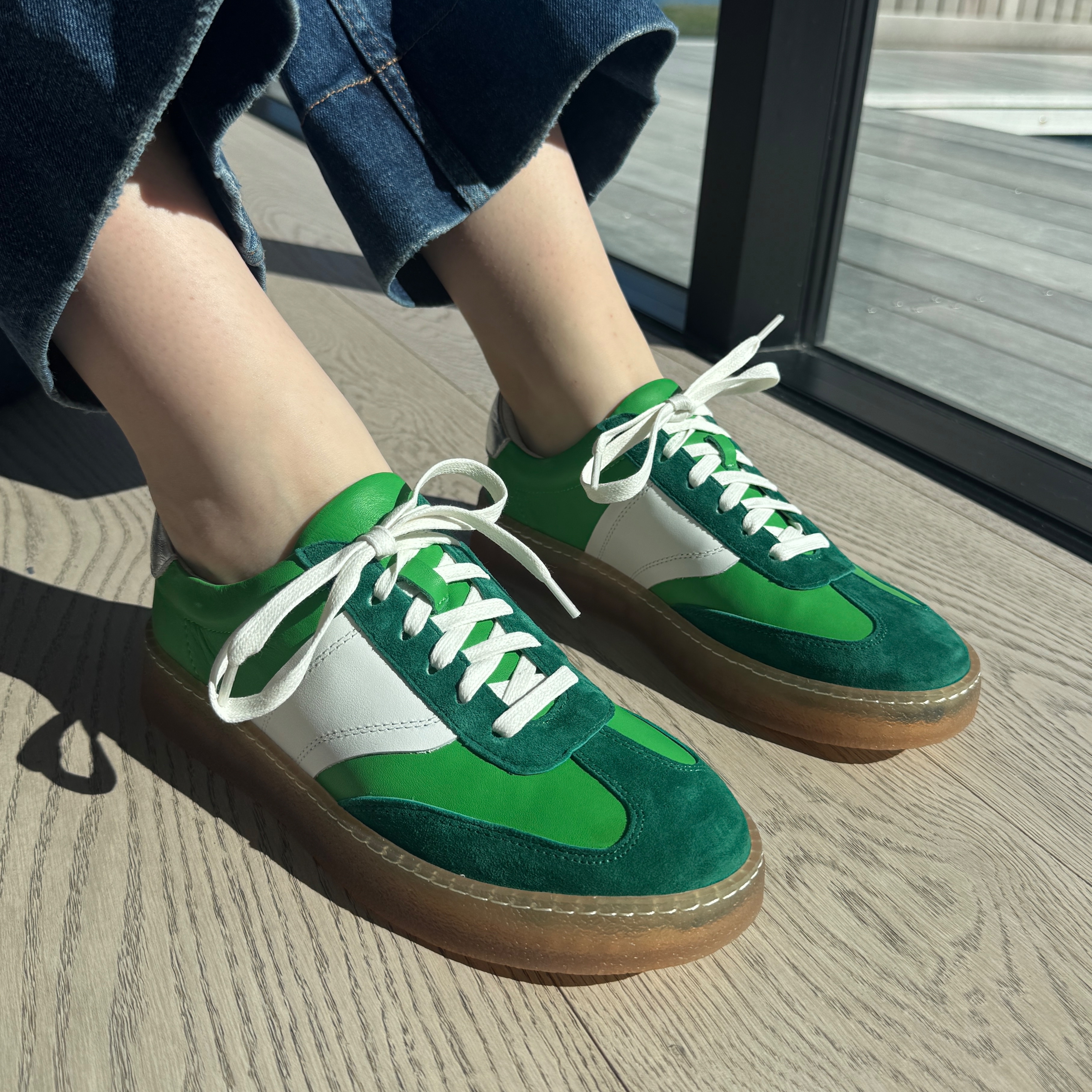 The Glow sneaker stands out with its bold green leather and suede panels, crisp white accents, and a silver heel tab, all set on a translucent gum sole that brings sporty flair to this retro-inspired design.