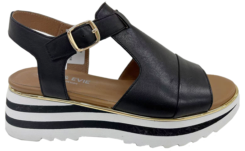 Step into bold summer style with the Hallie sandal by Alfie & Evie. Crafted from smooth black leather, this contemporary sandal sits on a striped flatform sole with a gold trim for a chic and modern finish. Perfect for elevating casual looks while keeping comfort at the forefront.