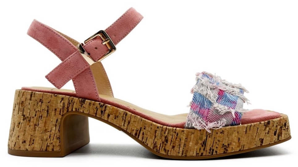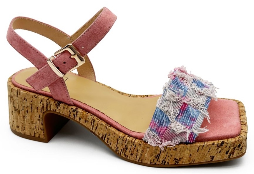 Add a playful touch to your summer style with the Jezza sandal by Mila Raine. Designed with a cork block heel, soft pink suede, and a frayed denim plaid strap, it brings both comfort and character to your warm-weather looks.