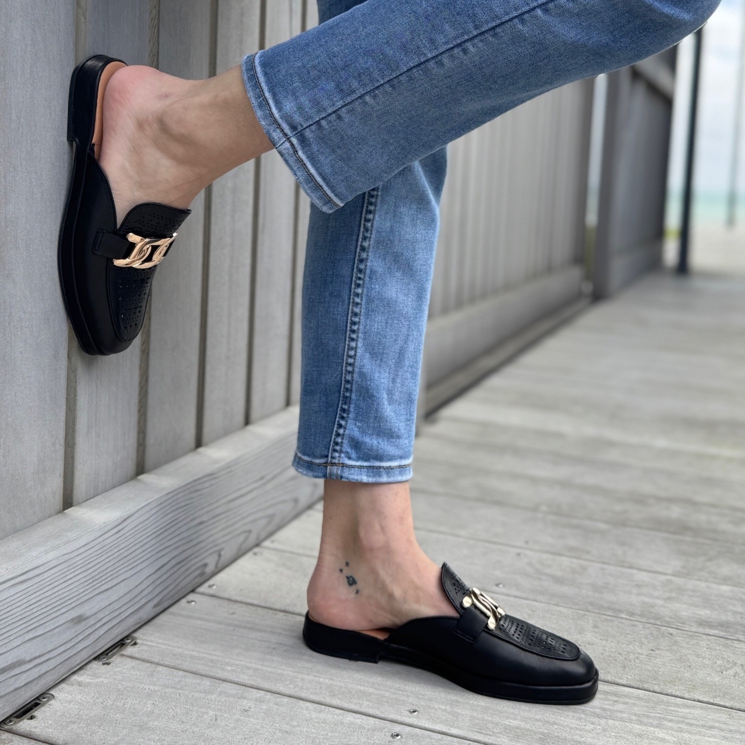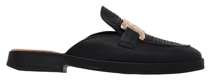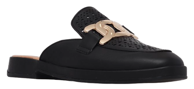 A FLEXIBLE SLIDE SLIP-ON LOAFER. FEATURING A MEMORY FOAM PADDED STITCHED LEATHER SOCK AND LASER CUT LEATHER UPPER WITH A FLAT GOLD TRIM. HEEL HEIGHT 2CM