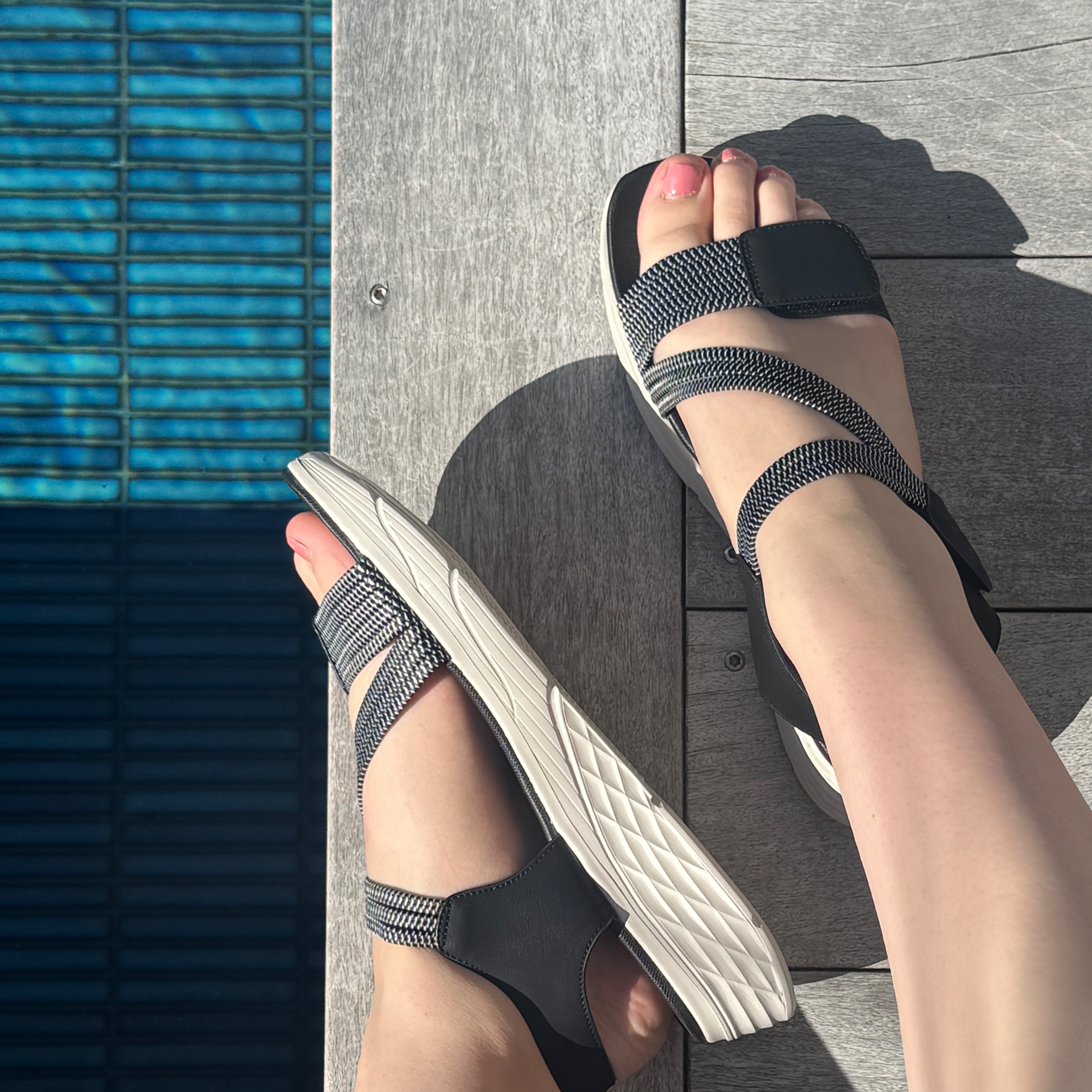 Sporty and supportive, the Menova sandal features a cushioned platform sole, elastic straps, and adjustable closures for all-day comfort on the go.