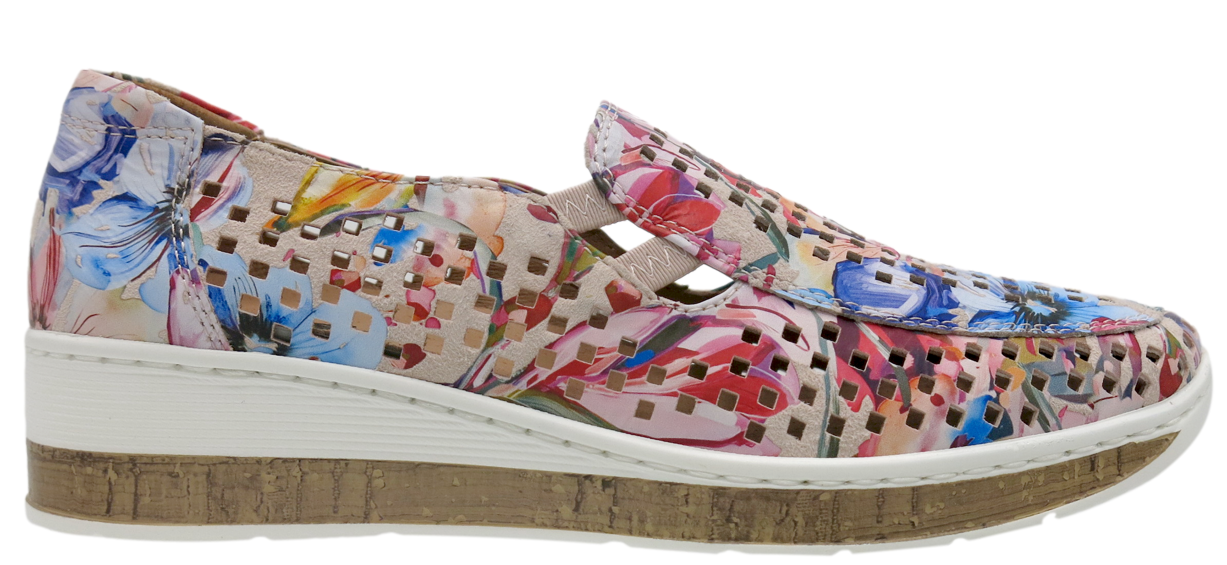 Monkey by Cassini is a playful slip-on crafted in soft leather with a vibrant floral print and airy cut-outs for all-day comfort. Its lightweight wedge sole and easy elastic side panels make it the perfect mix of fun and functional.