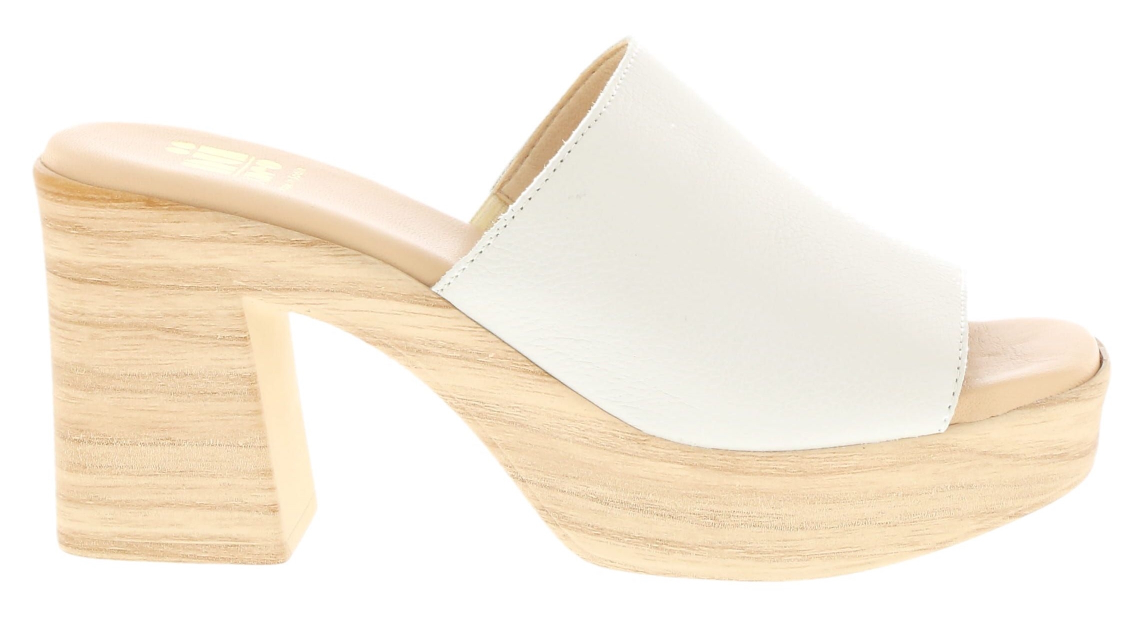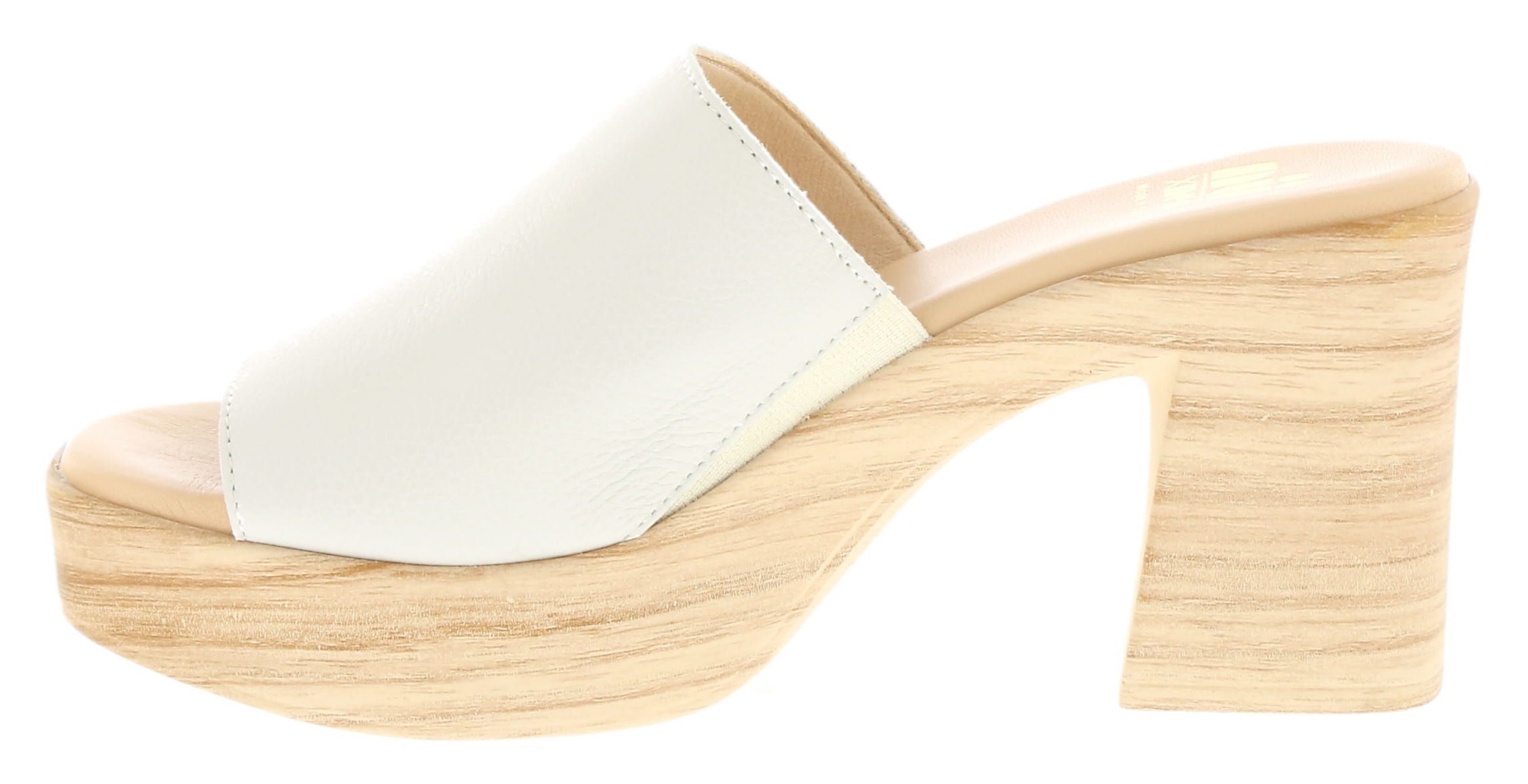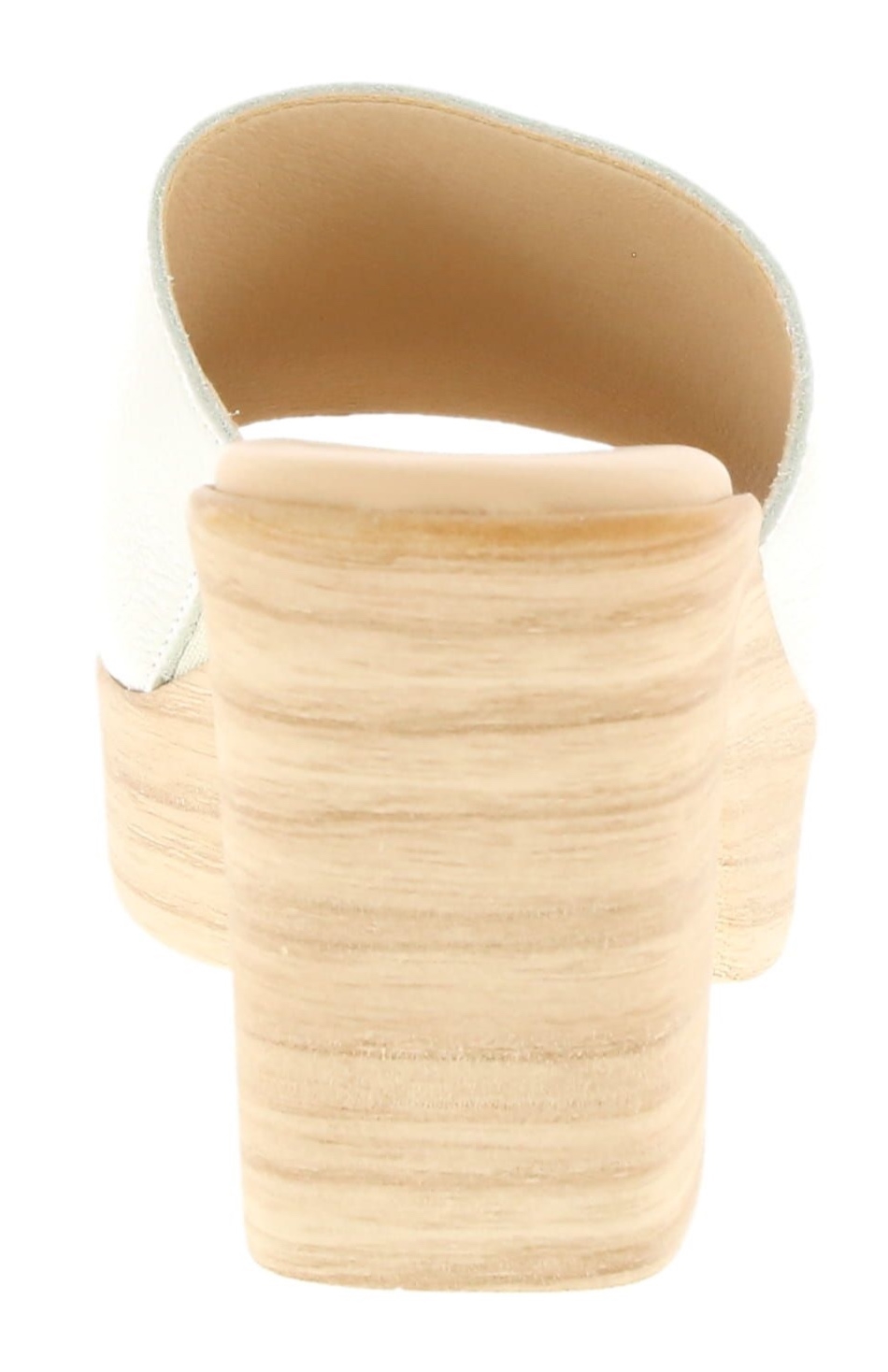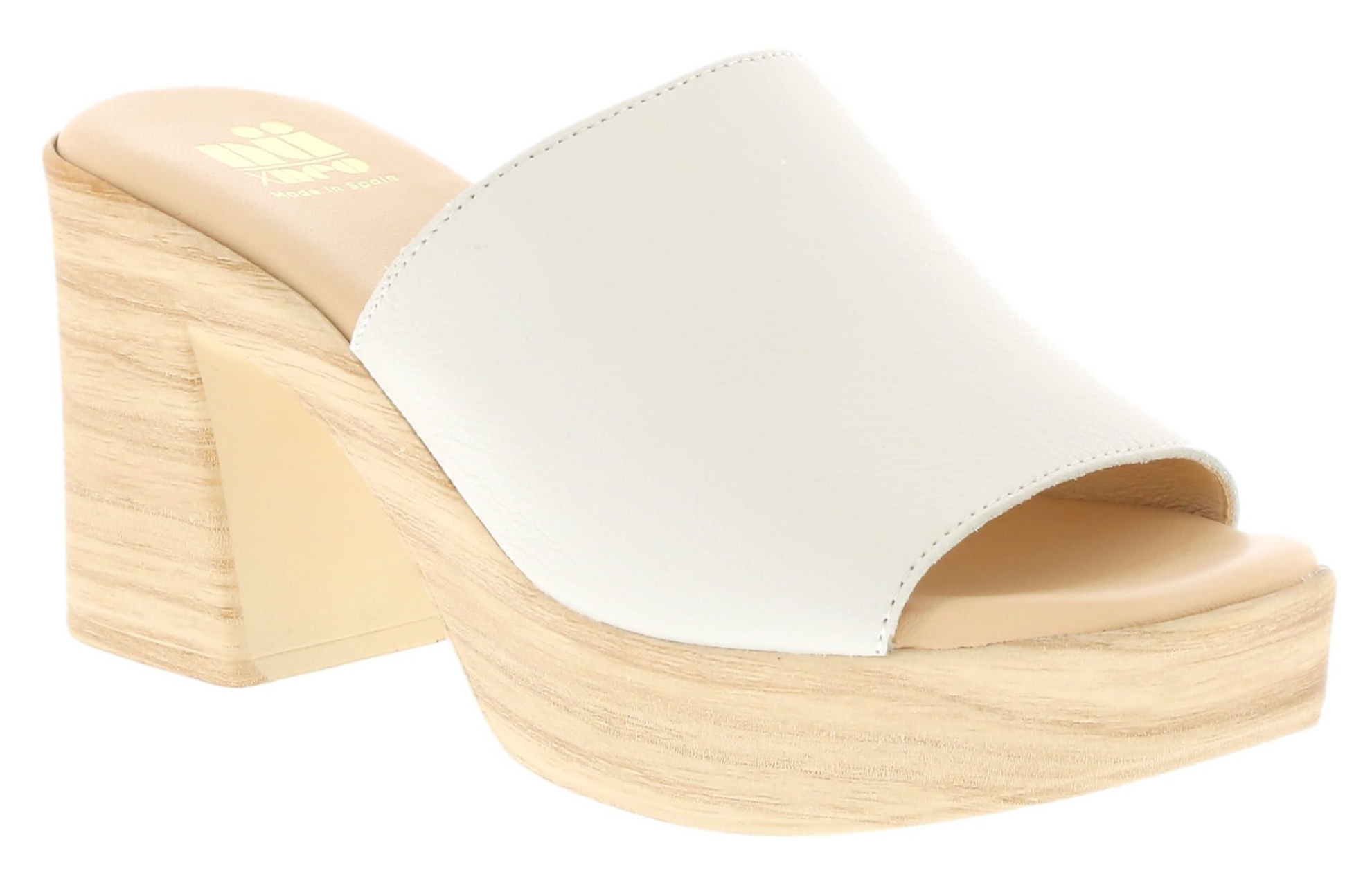 The Oceane mule by Neo is a modern block-heeled slide crafted in Spain from supple leather. Its sleek white upper and wood-effect platform heel create a clean, contemporary look with day-to-night versatility.