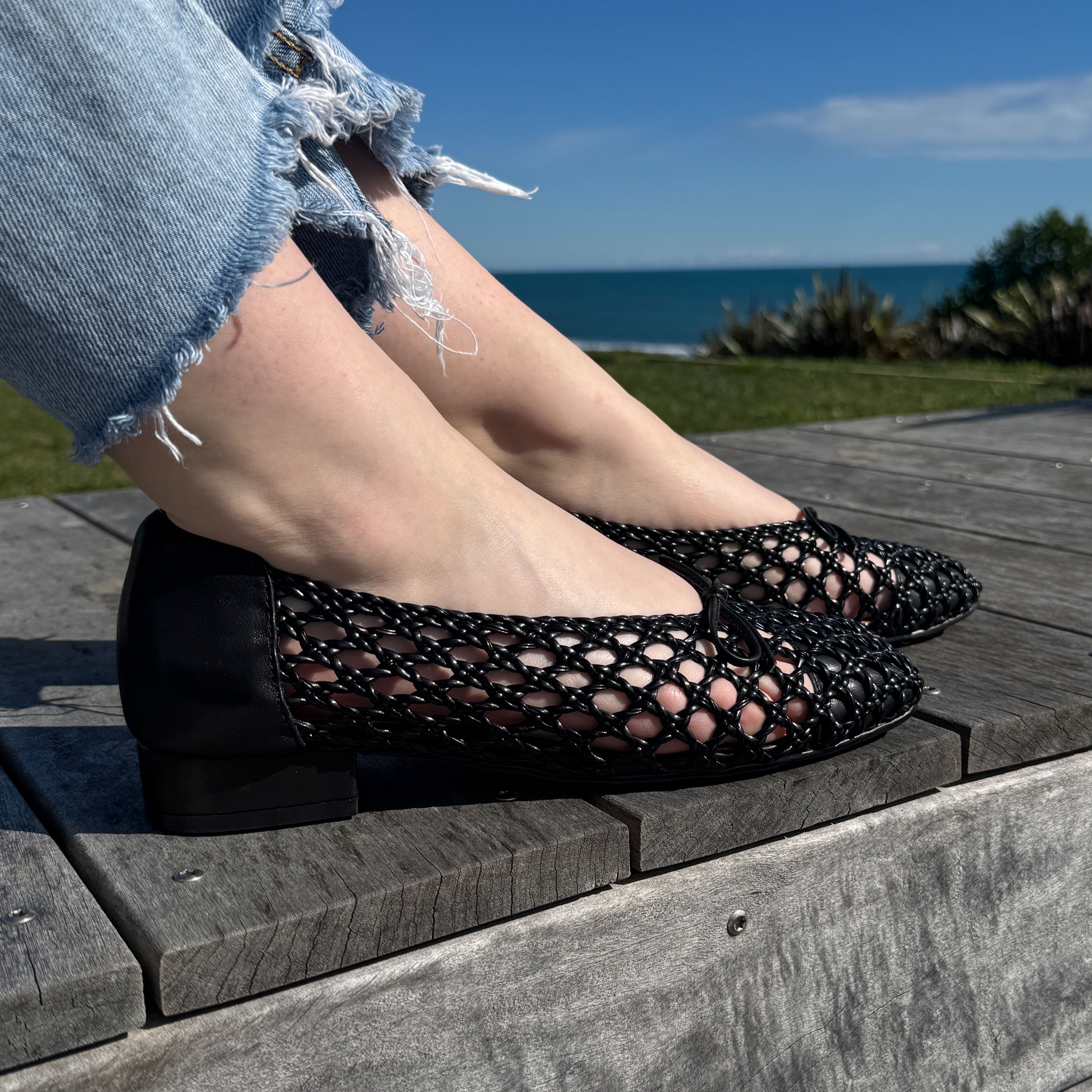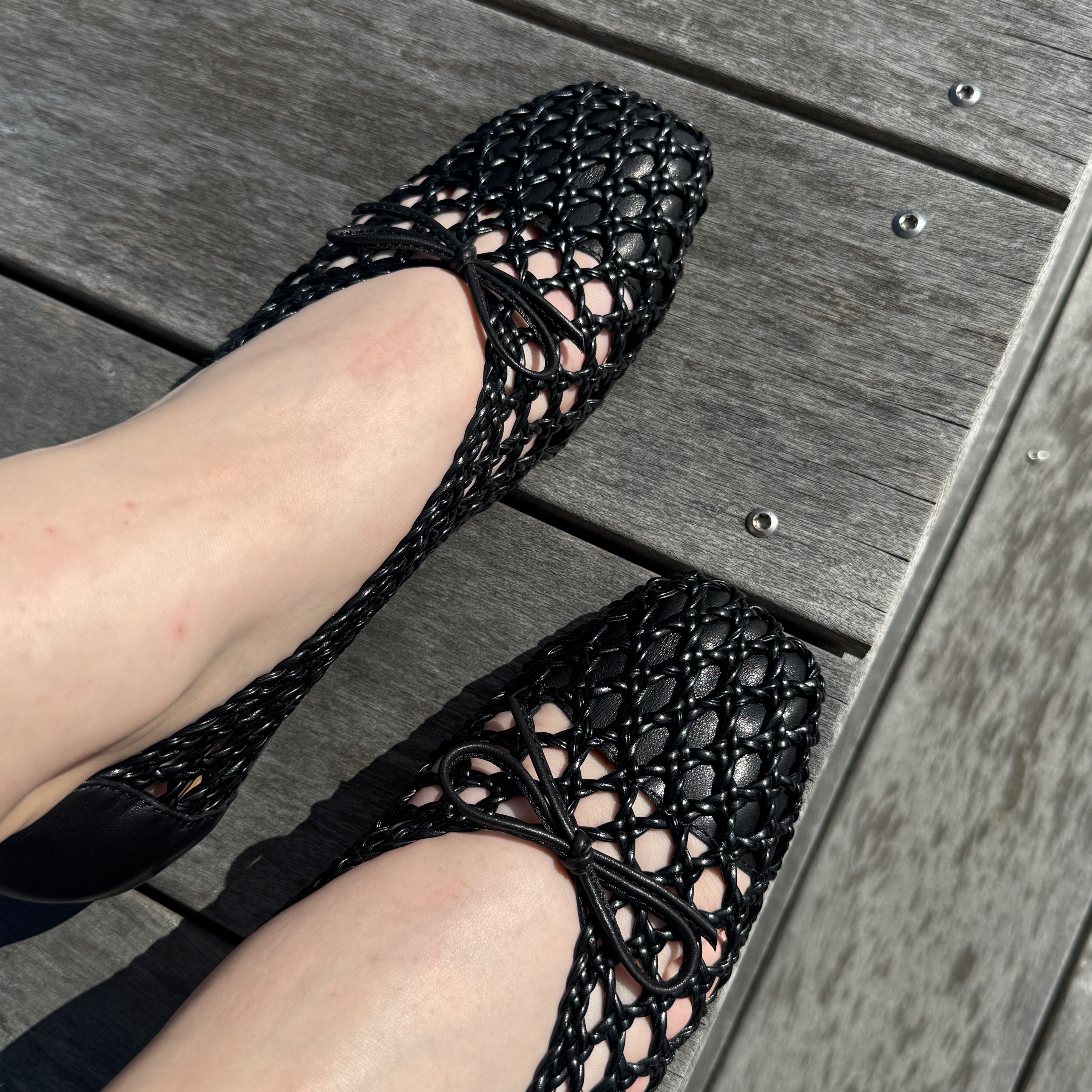 Breezy and modern, the Planet flat features a woven design, soft heel panel, and subtle bow detail, perfect for all-day comfort with style.