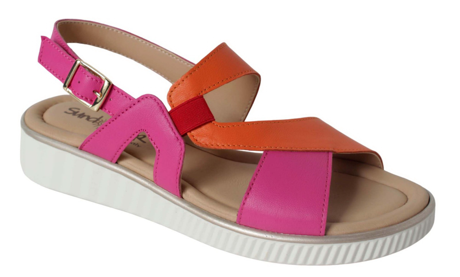 Brighten up your summer style with the bold two-tone Satina sandal. Crafted in Italy, this playful mix of orange and fuchsia leather brings a vibrant pop of colour while keeping you comfortable all day.