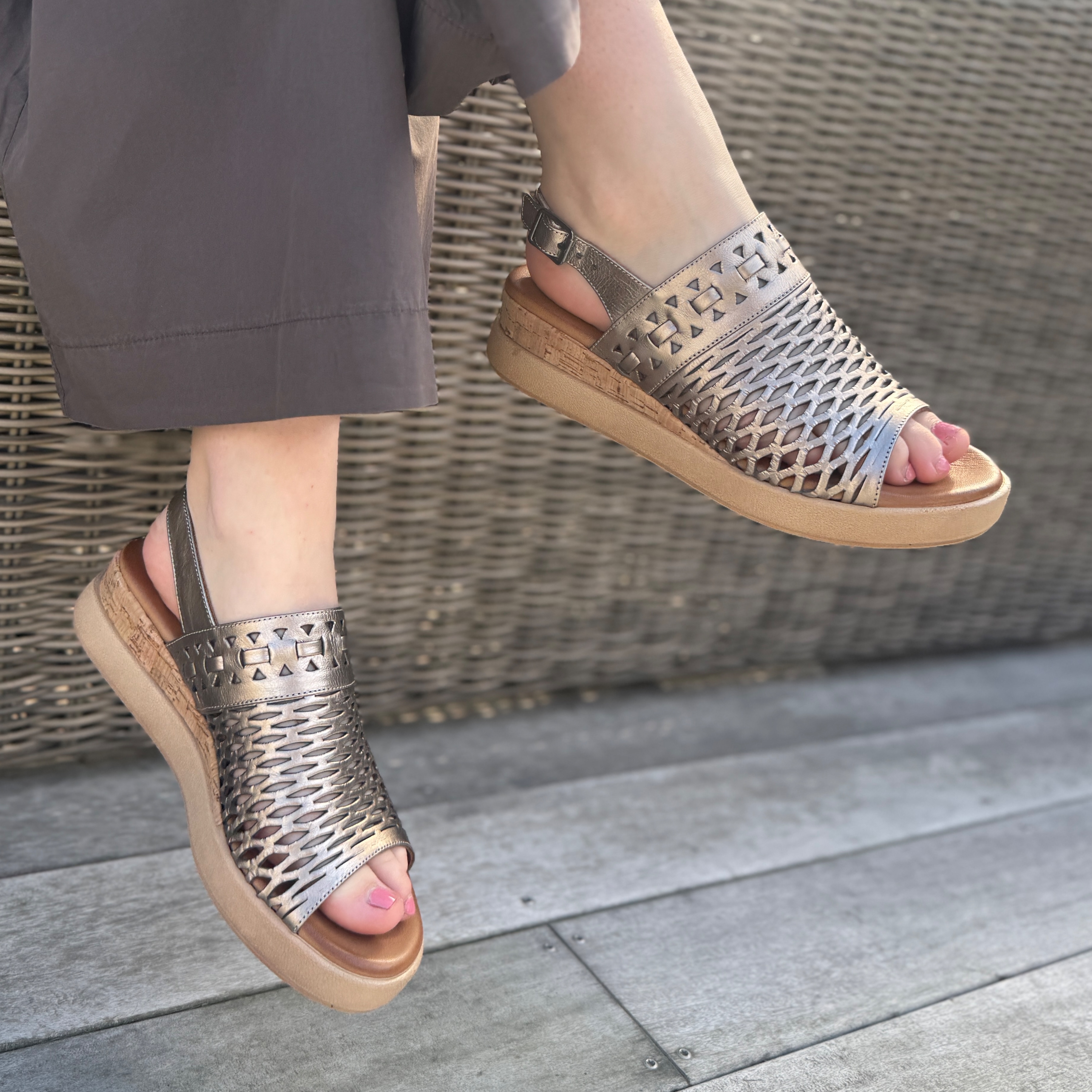 The Trippy sandal is a contemporary wedge style featuring intricately woven metallic gold leather that provides both breathability and visual flair. A secure ankle strap with a silver buckle enhances fit, while the cushioned insole and lightweight sole offer day-long comfort, perfect for adding a bold, artisanal touch to your summer look.