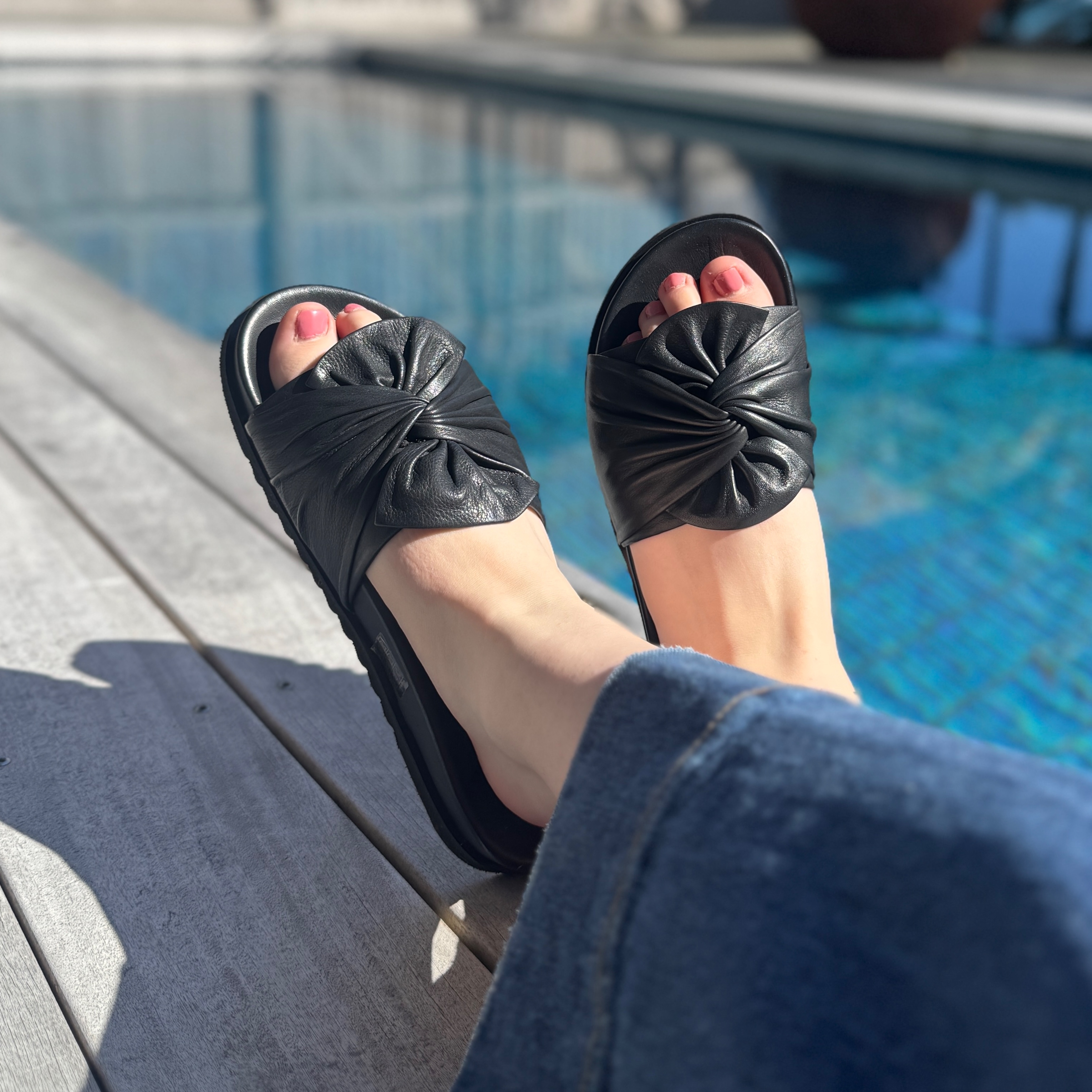 The Tubist sandal is a bold and modern slide featuring a soft black leather upper with a stylish knotted design. Set atop a thick, sculpted black sole with a jagged tread for added grip and edge, it combines fashion-forward detailing with all-day comfort. Perfect for elevating casual summer outfits.